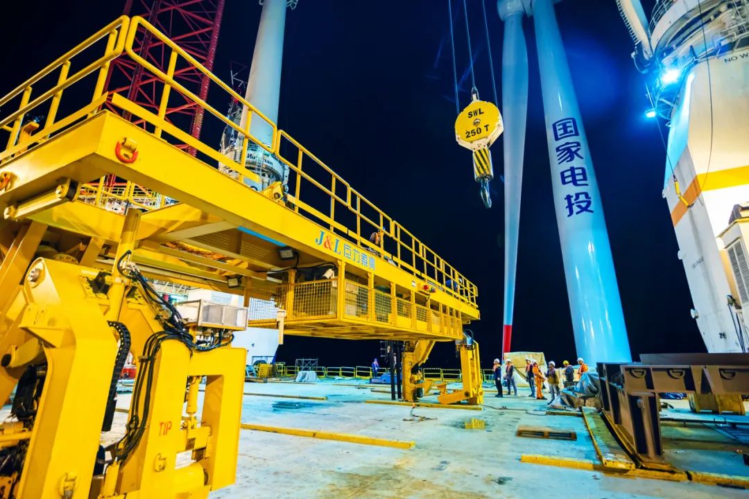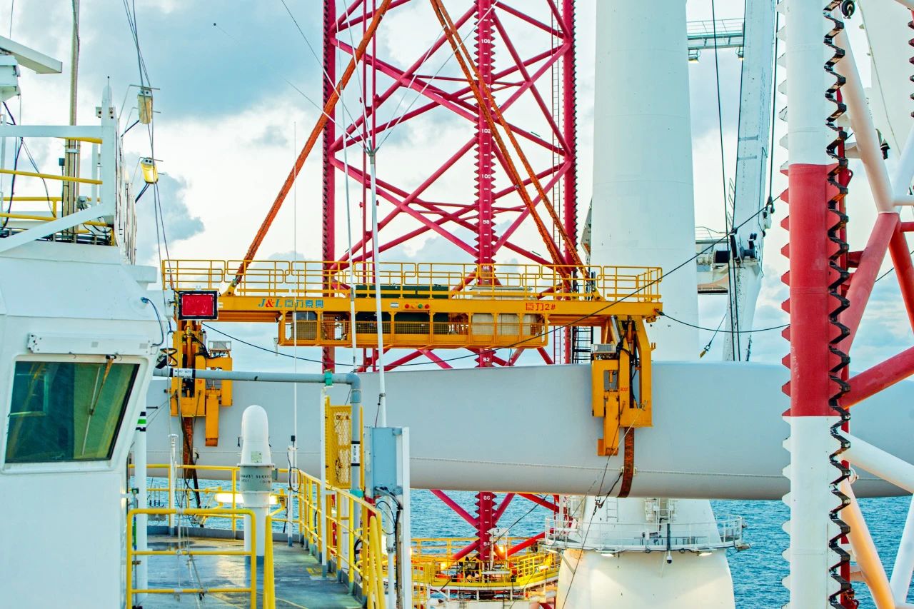 2021年8月19日,華能山東半島南4號海上風電項目順利完成首臺風機“整體”吊裝,風機整體最大重量為650噸,該吊裝設(shè)備包括運輸?shù)鬃⒕旨堋⑵胶饬骸㈦姎庀到y(tǒng)、液壓系統(tǒng)、緩沖系統(tǒng)等部件構(gòu)成,是巨力索具在北方沿海地區(qū)海上風電首個風機整體吊裝項目。開創(chuàng)了國內(nèi)海上風電實施5.0兆瓦以上單樁基礎(chǔ)風機整體吊裝先河。