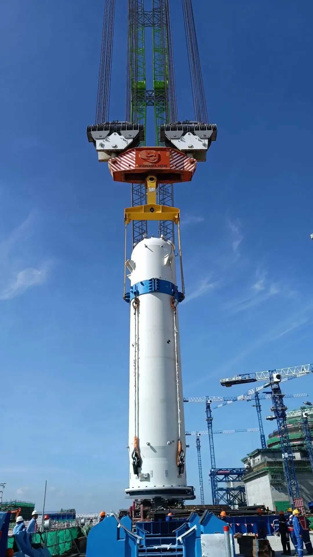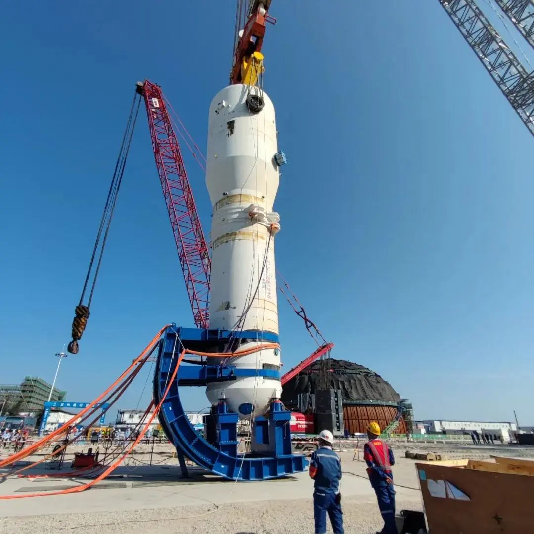 2022年8月,“華龍一號”漳州核電2號機組穩壓器通過“主設備預引入法”順利吊裝就位,巨力索具通過項目現場移動式翻轉支座、翻轉抱環、拉緊裝置,提供吊桿及吊梁等翻轉吊裝產品,使用3200t吊車在反應堆廠房外翻轉、吊裝引入至穩壓器間,全程保障項目吊裝順利進行。