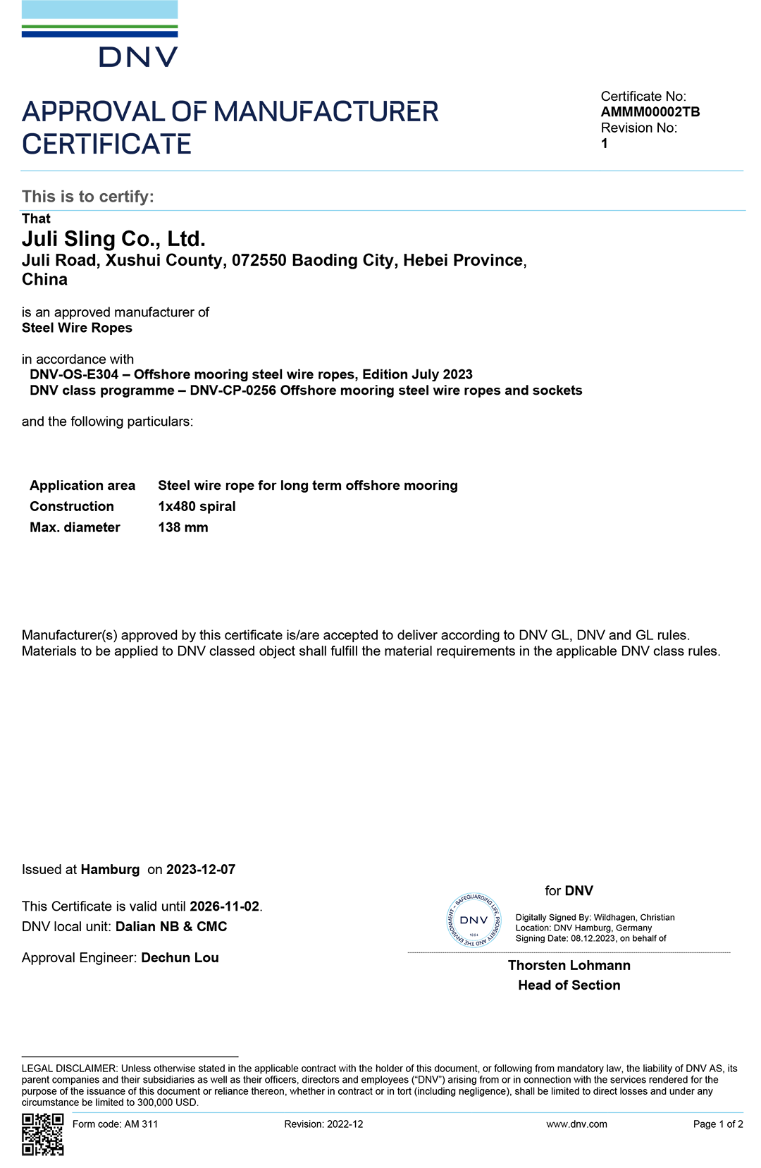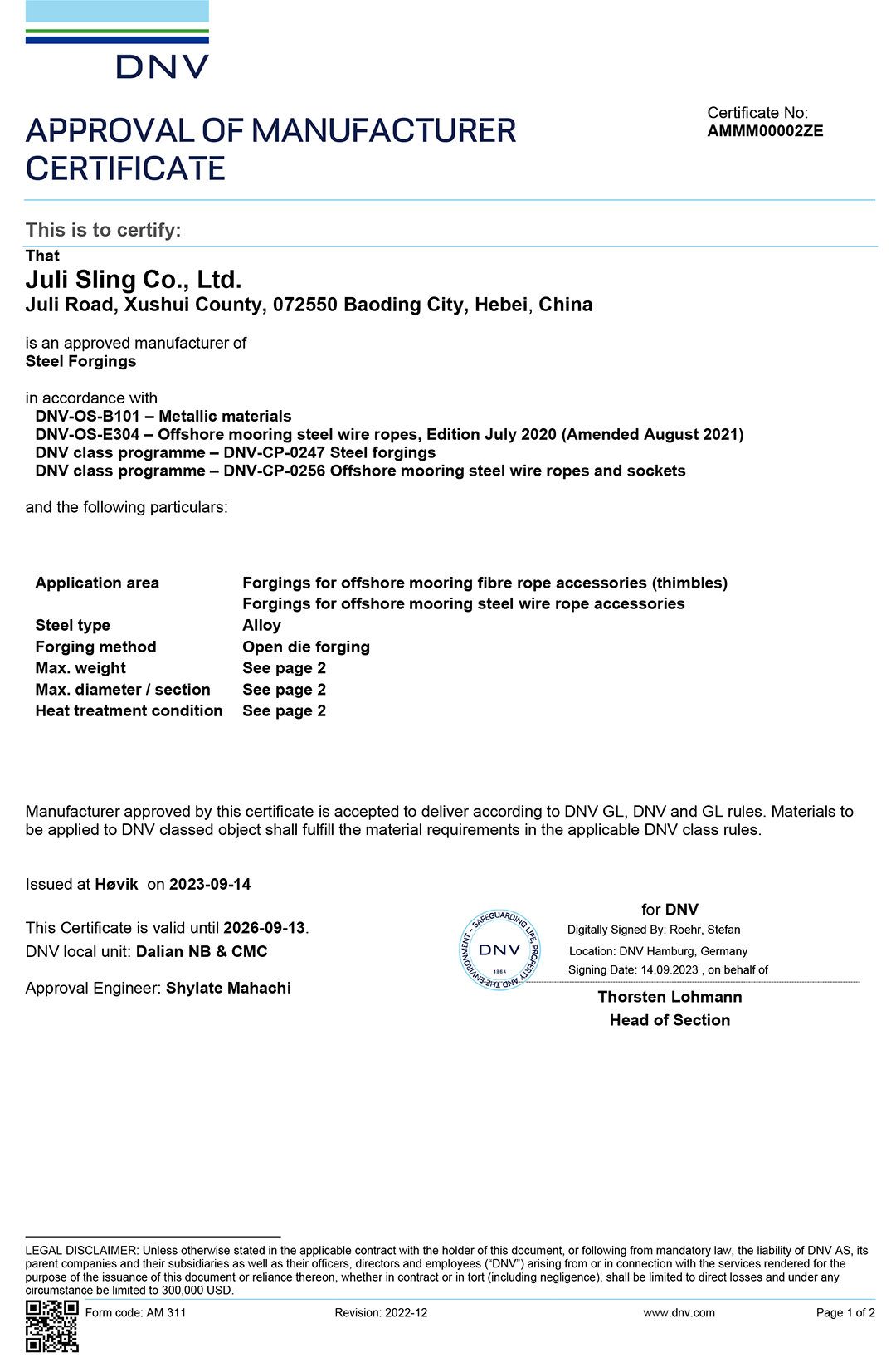 DNV長(zhǎng)期系泊鋼絲繩接頭及纜繩套環(huán)鍛件工廠認(rèn)可證書(shū)
