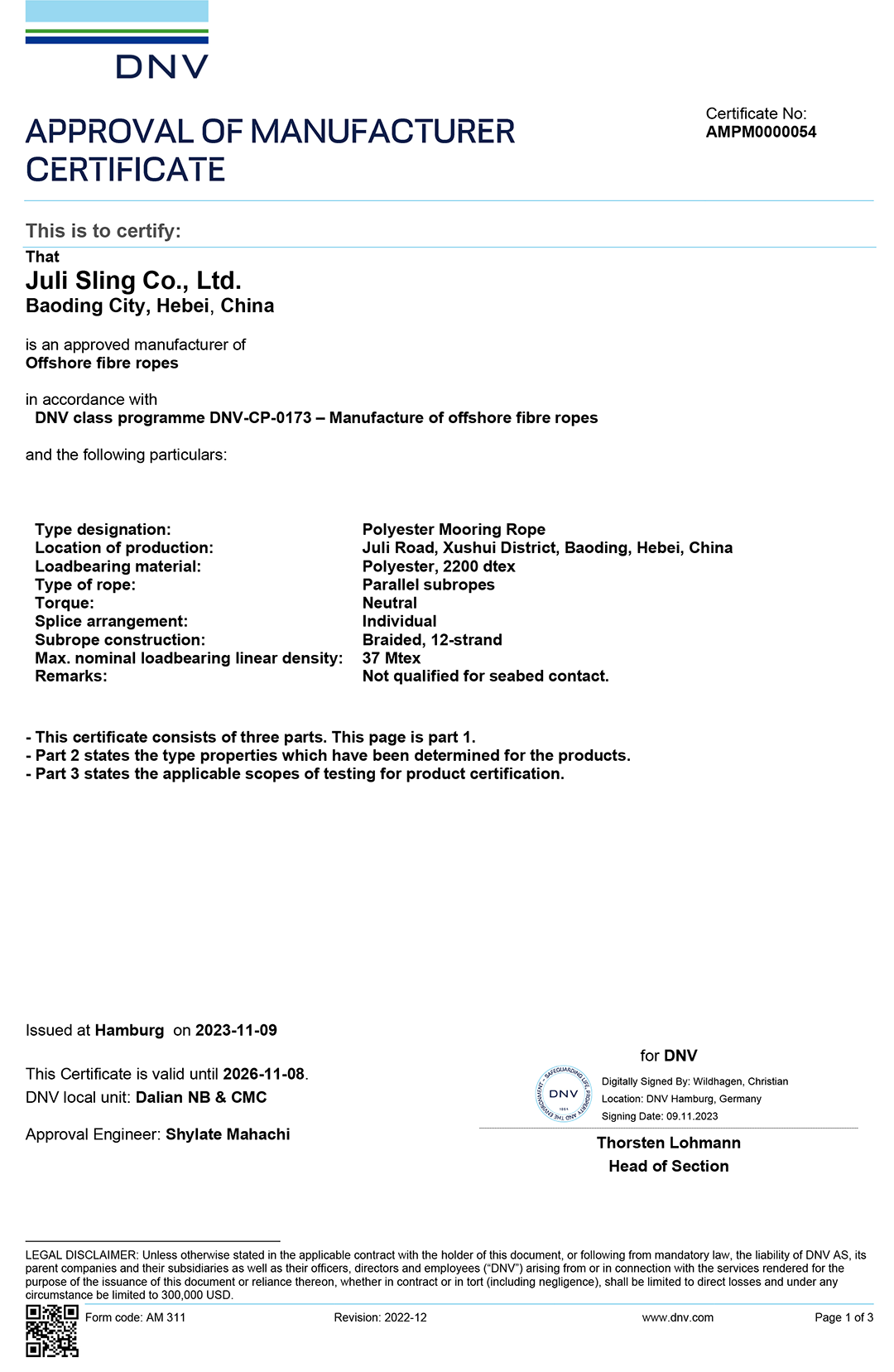 DNV長(zhǎng)期系泊纜繩(滌綸)工廠認(rèn)可證書(shū)