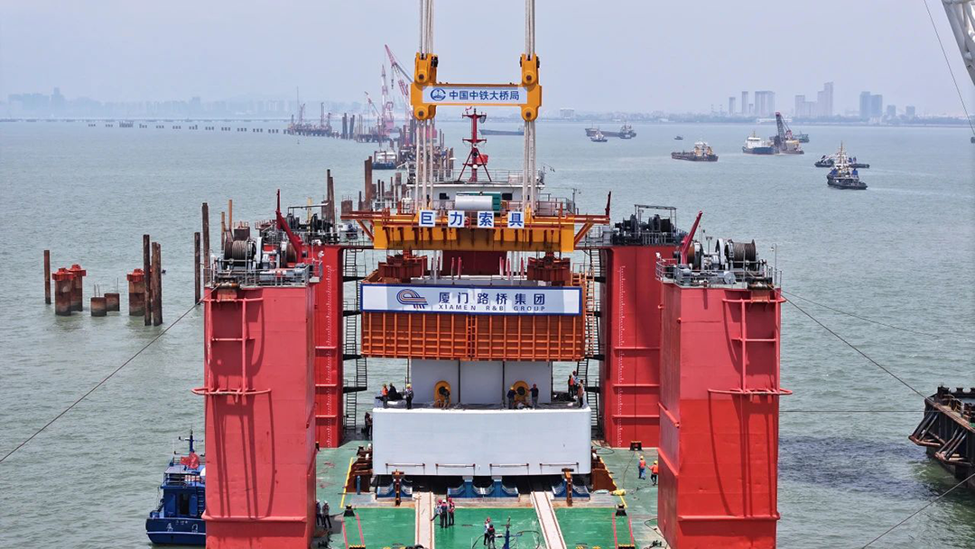 此次完成吊裝的預(yù)制墩臺(tái)體型巨大,長(zhǎng)15.3米、寬11.6米、高4.5米,總重量相當(dāng)于460輛標(biāo)準(zhǔn)貨車(chē)的載重總量。