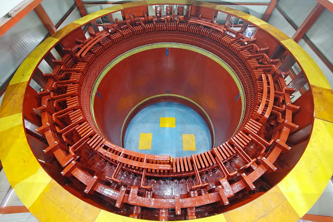 浙江天臺抽蓄電站是國內在建單機容量最大、全球水頭最高的抽蓄電站,其2號機定子堪稱電站核心設備中的“巨無霸”。定子外徑約8.1米,由15萬余張硅鋼片精密疊裝而成,整體起吊重量約482.7噸,是該電站開工以來吊裝的第三臺具有毫米級定位精度的超大單體設備。