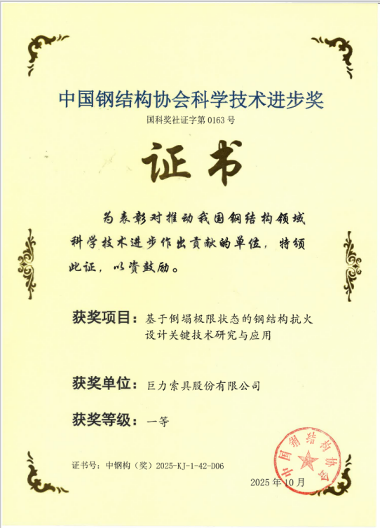 近日,2025年度中國鋼結構協會科學技術進步獎評審結果揭曉。在10月14日于廣西南寧舉行的頒獎典禮上,巨力索具股份有限公司憑借卓越的技術研發實力,一舉斬獲三項一等獎,充分彰顯了公司在高端索具技術領域的創新引領地位。