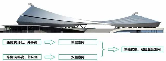 項目索結構為首創的車幅式單-雙層混合索網體系,共計42榀。其中西側看臺上方屋面較高,采用單層索網,共設計16榀徑向索;南北側及東側看臺上方為雙層索網,雙層索網內拉環間設置撐桿,共設計26榀徑向索,巨力索具承擔了環索和環索索夾的設計及生產工作,其中,由于該項目的索結構是單雙層索網的混合結構,索夾的設計及生產難度大,部分索夾的最大不平衡力超過750噸,在體育場館建設中屬于最大的。