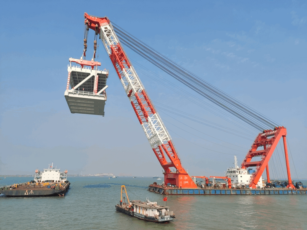 面對施工中高聳支架體系安裝、超高空吊裝、長距離同步拖拉滑移等眾多施工技術難題,加之該地域海工環(huán)境復雜,對吊具平衡性、安全性、精準度提出很大挑戰(zhàn),巨力索具項目團隊在吊具方案設計上,多次與項目部超前籌劃、比選論證專項吊裝施工方案,從吊具結構、材料性能、全橋鋼箱梁兼容性等方面進行優(yōu)化升級,確保吊裝工作順利進行。