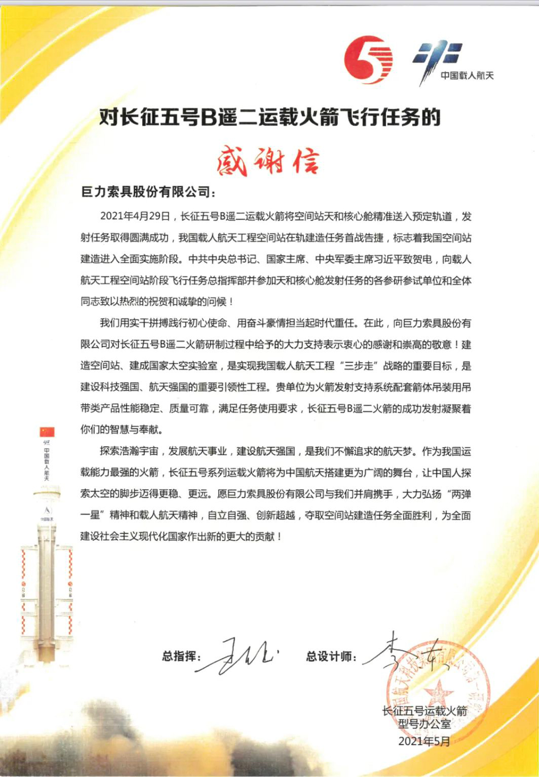 巨力索具作為航天事業合作伙伴,自參與以來,一直希冀依托自身專業能力在航天領域發揮優勢,助力航天事業蓬勃發展。